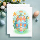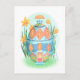 Au-dessus d'un oeuf de Pâques peint en pastel, une minuscule table extérieure trône au milieu des jonquilles jaunes. Illustration originale de Noël Snow.