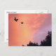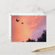 Cette belle carte postale photographique en beaux-arts capture deux colombes qui s'envolent au coucher du soleil. Le ciel semble être en feu avec des nuages aux couleurs arc-en-ciel de rouge, orange, jaune, bleu, magenta et violet. Seuls les sommets des arbres sont en silhouette noire.