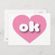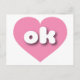Cette carte postale est dotée d'un coeur rose cool et calme contenant les lettres basses coques blanches, arrondies et audacieuses ok, une version ludique de l'abréviation pour Oklahoma, l'état le plus tôt. Le verso de la carte postale est vide, en attendant votre texte customisé ou vos sentiments manuscrits.