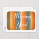 Envoyez un message pour leur dire que vous les manquez avec l'une de nos cartes postales personnalisées. Orné d'une belle couverture orange, bleu et jaune avec des lettres manuscrites la phrase Missing You sur le devant. Customisez le dos avec votre adresse. Consultez notre sélection complète de cartes de voeux dans notre boutique Zazzle!