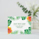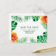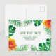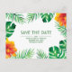 Enregistrez la carte postale Date avec des feuilles tropicaux et des fleurs d'hibiscus orange sur le noir. Personnalisez cette conception en modifiant le texte, la couleur du texte et la couleur arrière - plan. Vous pouvez même ajouter du texte au verso.