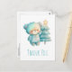 Carte de remerciement avec une illustration adorable. Un ours douillet avec des étoiles et des étincelles dans sa fourrure. Debout à côté d'un arbre de Noël. Couleur bleu-vert pastel. Fantaisiste et mignon.