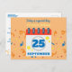 Célébrez un jour spécial avec notre carte postale d'anniversaire vibrante et personnalisable ! Ce design arbore un style graphique ludique et festif, parfait pour marquer des étapes mémorables. Au cœur de la carte postale se trouve une illustration charmante d'un calendrier, avec une date spécifique encerclée pour honorer le grand jour de la personne qui fête son anniversaire. Le nombre « 25 » est visible en évidence dans un cercle, symbolisant la date, tandis que le mois « SEPTEMBRE » est écrit en lettres majuscules grasses en dessous.
