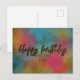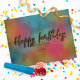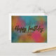 Design moderne et tendance de carte d'anniversaire personnalisée avec le texte "Joyeux anniversaire" écrit en écriture script pailleté doré sur un fond aquarelle coloré.