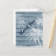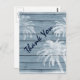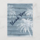 ~Ce design de carte postale sur le thème de la plage est orné d'un toit de palmier sur un arrière - plan en bois rustique dans les tons bleu et blanc.