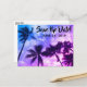 Cette carte postale amusante et moderne, à l'exception de la date, comporte une photo de palmiers. Parfait pour un mariage ou un événement de destination avec un thème tropical! Le texte de la carte postale peut être customisé pour votre événement.