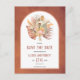 Feuilles de palmiers séchés tropicaux, pampas herbe et protéa fleurs terre cuite mariage arche Enregistrer la date carte postale. Ce design mariage moderne dispose d'un cadre en arc sur arrière - plan taché de terre cuite. Dans le cadre il y a un bouquet d'aquarelle de feuilles de palmiers séchés, des fleurs de protéa et de l'herbe de pampas.