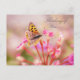 Un petit papillon Cuivre avec des ailes tachetées d'orange et de noir repose délicatement sur des fleurs roses vives. L'arrière-plan flou ajoute une qualité rêveuse à la scène, améliorant la beauté naturelle et la tranquillité. Cette carte postale "Pensant à Vous" peut être personnalisée si vous le souhaitez.