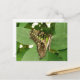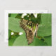 Cette superbe carte postale présente une photo d'un beau papillon tropical. Il a de belles marques vertes irisées sur toutes ses ailes. Il a ses ailes pliées tandis qu'il repose sur quelques feuilles. La photo a été prise en utilisant la macro photographie pour un résultat étonnamment détaillé.