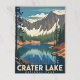Une affiche de voyage de style vintage pour le parc national Crater Lake présente le lac bleu profond reflétant les montagnes enneigées et les forêts de pins sous un ciel bleu clair. Le "PARC NATIONAL DU LAC CRATER" est audacieusement exposé au fond.