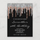 Une jolie invitation par carte postale pour sa fabuleuse fête du 40e anniversaire. La parties scintillant en or rose et argent brillant faux gouttes créées avec des graphismes d'art numérique contre le noir solide. Customisez l'élégant style de police, la taille, l'espacement et la couleur selon vos besoins. Invitations de fête d'anniversaire personnalisables. Glam et invitations chic. Si vous voulez l'option d'enveloppe... vous pouvez tout effacer sur le côté arrière et changer la couleur arrière - plan du blanc au noir.