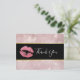 Carte postale Merci avec un arrière - plan composé de feuilles tropicaux en or rose. Le dessus est recouvert d'un cadre noir avec une bordure dorée, à l'intérieur sont des lèvres de loterie rose.