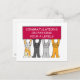 Quatre chats caricaturaux brandissant une pancarte couleur cerise qui dit "Félicitations de passer vos niveaux A".