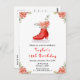 Cette invitation à l'anniversaire d'aquarelle élégante et festive comprend une botte de patinage sur glace rouge aquarelle et de belles fleurs de poinsettia rouge floral. Le texte combine écriture manuscrite et polices sans serif pour un look élégant et moderne. C'est parfait pour les fêtes d'hiver et de Noël.