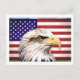 Une carte postale représentant un aigle beau et fort devant un drapeau classique des États-Unis.