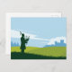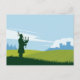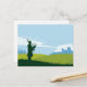 Carte postale graphique illustrant un paysage écossais avec un homme en silhouette dans un kilt jouant de la cornemuse, debout sur une colline au milieu d'un champ vert. L'arrière - plan contient un château et des arbres et quelques nuages dans le ciel.
