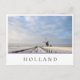 Photo carte postale d'une vue minimaliste sur un paysage hivernal en Hollande avec un chemin et un canal vers un moulin à vent sous une couche de neige avec de beaux nuages au lever du soleil dans la campagne hollandaise avec une bordure blanche et dans une boîte blanche le texte 'Holland' et avec des rayures dans les couleurs rouge, blanc et bleu, les couleurs du drapeau hollandais.
