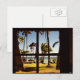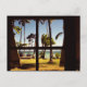 Scène de plage tropicale Fiji Beach - Photo d'une plage aux Fidji avec palmiers, hamacs et banc de pique-nique vu à travers les volets ouverts d'une cabane de plage. © Alan Harman Photography 2004. Tous droits réservés. www.alanharmanphotography.com 120418 carte postale