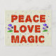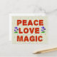 Des lettres aux couleurs vives, orange, rouge et jaune, aux coeurs épelent les mots "Peace Love Magic", et sont entourées d'un arc-en-ciel d'étoiles et de champignons violets.