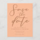 Peach est la nouvelle couleur tendance pour les mariées d'été. Notre mariage de pêche douce Save the Date propose un élégant script marron clair pour un événement tendance et minimaliste dans l'après-midi pour une mariée féminine qui aime rester à jour et moderne.