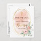 Baptême Élégant Enregistrer La Carte Postale Date. Conception à l'aquarelle pêche, arrière - plan rose rousse et cadre ovale géométrique or et arrangement floral sur l'avant avec croix or et Baptême en écriture feuille or. Ajoutez plus de détails sur le dos de la carte postale. Pour modifier ce modèle, cliquez sur customiser plus loin.