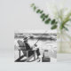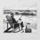 Cette image représente un homme plus âgé assis sur une chaise en bois à la plage, engagé dans la pêche. Il porte un casquette et semble détendu, tenant une canne de pêche. A côté de la chaise, il y a un petit glacière et une radio portable sur le sable. Les vagues de l'océan sont visibles dans l'arrière - plan, suggérant un mouvement. Le ciel est rempli de nuages, ajoutant à l'atmosphère sereine de la scène.