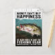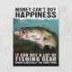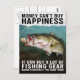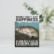 Une basse à grande bouche nage vers la caméra avec un leurre dans sa bouche. L'image est sous-titrée d'un message humoristique sur la relation entre argent et bonheur.