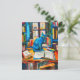 Un chat noir bleu est assis sur un bureau entouré de livres ouverts dans un cadre cosy et érudit. Peinture