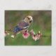 Une finche jaune pâle, noir et blanc avec des plumes d'ailes bleues et un bec lourd - un casse-noix volant! En fait, en français, il est connu comme le noisette grosbeak. Illustration numérique d'une photo d'un oiseau perché sur une branche de fleur rose. Art numérique par france rurale.