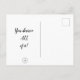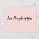 Carte postale classique, mais simple pour les moments où vous avez une pensée fugace spécifique sur quelqu'un et que vous voulez "rapidement" les faire savoir. Un appel téléphonique sera certainement faire, mais cette conservation spéciale dure aussi longtemps que le destinataire le désire. Rejoignez et surprenez quelqu'un avec votre attention! Il y a beaucoup de couleurs et une variété de messages à choisir.