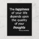 Célébrez les citations inspirées au sujet de la vie et du bonheur. Pensées de qualité ? Puis une vie heureuse… La citation réelle de l'empereur et du philosophe romains Marcus Aurelius est : "Le bonheur de votre vie dépend de la qualité de vos pensées : , gardez donc en conséquence, et faites attention que vous n'amusiez aucune notion déplacée à la vertu et à la nature raisonnable." Noir et blanc.