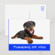 Qui peut résister au visage mignon d'un chiot Rottweiler ? Cette carte postale douce présente un chiot Rottweiler noir et brun sur un arrière - plan blanc et propre. Sous le chien se trouve le salut Penser de vous qui est mis en surbrillance sur un arrière - plan bleu vif. Laissez ce doux Rottweiler vous aider à envoyer des salutations à votre famille et vos amis.