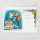 NOËL REMERCIE Père Noël recouvert de bleu se prépare à descendre la cheminée, sac de jouets sur son dos, cloche & sainte en haut à droite.