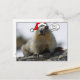 Cartes postales de Noël colorées que vous pouvez envoyer n'importe où. Un écureuil de Père Noël portant un casquette du Père Noël pose sur une branche d'arbre. "Bonnes Fêtes" est écrit en écriture noire dans une bulle vocale provenant de la bouche de chien des prairies.