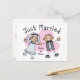 Joli couple en bâton joyeux avec les coeurs roses dans l'arrière - plan. La mariée porte une robe mariage et le marié porte un smoking avec cravate arc. Le texte dit JUST MARRIED. Customisez-le avec votre date de mariage ou ce que vous voulez. Parfait pour votre lune de miel. PinkInkArt original !