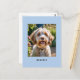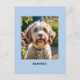 Créez votre propre carte postale avec une photo préférée de votre chien ou chat animal de compagnie, avec leur nom sous un arrière - plan bleu. L'envers est blanc avec la disposition standard des cartes postales. Cliquez sur "Personnaliser" pour télécharger l'image choisie et entrer le nom de votre animal de compagnie. Vous pourrez prévisualiser le résultat avant de le retirer. Envoyez aux amoureux des animaux entre vos amis et votre famille, pour qu'ils puissent profiter de la photo mignonne de votre ami à quatre pattes.