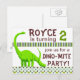 Rejoignez-nous pour une soirée dino-mite ! Fabriqué avec un dinosaure vert aux bordures rayées et pois aux couleurs bleu, marron et vert. Ajoutez des informations sur la fête au dos et veillez à personnaliser le nom et l'âge.