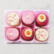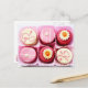 Chocolats roses et blancs assortis de diverses garnitures, décorés d'initiales et de fleurs.
