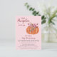 Un joli citrouille d'aquarelle aux fleurs d'automne et un arrière - plan rose doux complètent cette douce Petite Invitation Baby shower Citrouille. Personnalisez toutes vos informations de baby shower avec commodité. Envoyez cette carte postale d'invitation baby shower pour des économies et de la commodité. Parfait pour un baby shower d'automne pour une fille.