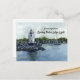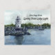 Carte postale souvenir avec vue inspirée de la Lumière de la haie de Spring Point dans le sud de Portland, Maine avec voilier dans l'eau sur une main moody day peinte à l'aquarelle. À l'intérieur, vous pouvez modifier une nuance coordonnée de texte vert et blanc pour répondre à vos besoins.