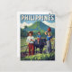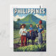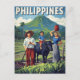 A beautiful vintage-style travel poster celebrating the rural beauty and strong community of the Philippines. The illustration features a Filipino farming family—a man with a plow, a woman carrying a jar, and a child riding a carabao (water buffalo)—set against lush rice paddies and a green mountain. This retro artwork is perfect for those who love travel, appreciate Philippine culture, or collect classic Asian-themed poster designs.