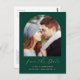 Cette carte postale simple et minimaliste Save the Date présente une photo en forme d'arc au-dessus des mots "Save the Date" dans un élégant script d'écriture dorée, suivi des noms du couple, date mariage et ville en sans serif police sur un arrière - plan vert émeraude. Ajoutez votre adresse de retour ainsi que des détails supplémentaires au verso.