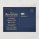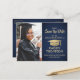 Partagez la joyeuse nouvelle de votre fête de remise de diplôme imminente ainsi qu'une photo avec ces cartons d'invitation modernes de sauvegarde de date en bleu marine et or. La photo et tout le texte sont faciles à personnaliser. Le design présente un chapeau de diplômé en faux métal doré, une calligraphie de style manuscrit, une typographie minimaliste moderne avec le nom du diplômé, l'année de promotion et l'école, ainsi qu'une photo de votre choix, comme une photo de fin d'études ou une image de la cérémonie de remise des diplômes. Veuillez noter que l'or est une couleur imprimée, et non une feuille métallique. Cette carte élégante d'annonce de remise de diplôme est un moyen chic et stylé de commencer la célébration de votre journée spéciale.
