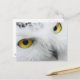 Chouette blanche enneigée aux yeux jaunes piercing.