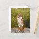 Cette carte postale présente une photo d'un corgi debout sur ses pattes arrières et souriant.