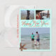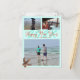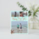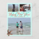 Carte postale du Nouvel An thème plage. Couleur bleue tropicale avec texte orange et un espace pour imprimer une adresse postale. Téléchargez trois photos, avec deux images plus petites en haut et une photo plus grande en bas. Une étoile de mer marron décore le coin et la date de la nouvelle année est en grands chiffres derrière le message de vœux. Si la saison des fêtes vous a échappé, envoyez une carte pour la nouvelle année.