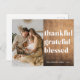 Partagez la chaleur de la saison avec cette carte de vœux de Thanksgiving rustique « Thankful Grateful Blessed » (Reconnaissant, Chanceux, Béni), avec une typographie blanche en gras sur un fond en bois riche ainsi que votre photo de famille chérie. Parfait pour envoyer des vœux de vacances sincères ou inviter vos amis et votre famille à votre célébration de Thanksgiving ou de Friendsgiving. Personnalisez avec le nom de votre famille et l'année pour créer un souvenir qui capture l'esprit de gratitude et de convivialité.