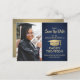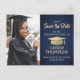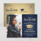 Partagez les nouvelles joyeuses d'une fête de graduation à venir avec photo marine bleu et faux feuille d'or enregistrer les invitations de la carte postale date. L'image et le libellé de ce modèle sont simples à personnaliser et les couleurs peuvent être changées avec l'outil de design Zazzle. Customisez-le avec le nom du diplômé, l'année de classe et d'autres détails de faire-part de votre choix. Le design comprend un faux arrière - plan et un casquette de tableau de mortier, une élégante calligraphie moderne, une typographie vintage classique et une photo préférée, comme une photo de haut rang ou une image de la cérémonie de début. Veuillez noter que l'or est imprimé en couleur et non en métal. Ces cartes de graduation élégantes sont une façon élégante de partager une fête spéciale avec votre famille et vos amis. Félicitations au diplômé !