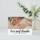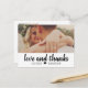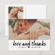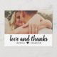 Cette carte de remerciement postale fraîche et moderne présente un script pinceau audacieux "amour et remerciements" sur un panneau blanc épuré, associé à votre photo de mariage ci-dessus pour un look graphique lumineux. Les noms de couple personnalisables sont affichés sous le script, gardant le design personnel et chaleureux. Une option charmante pour les couples qui aiment le design épuré avec une touche décontractée et sincère.