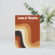 Cette carte postale rétro amusante d'amour et de remerciement présente des lignes ondulées en beige, brun et orange, rappelant les années 70 et le style de vie hippie. Une carte postale de mariage vintage audacieuse avec un script blanc funky à côté des lignes courbes abstraites. Groovez avec cette carte de remerciement amusante de ton de terre.